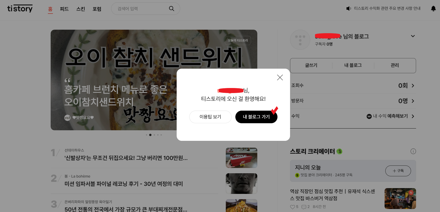 그럼 이렇게 나만의 블로그가 만들어졌고 바로 갈 수 있게 팝업창이 떠요