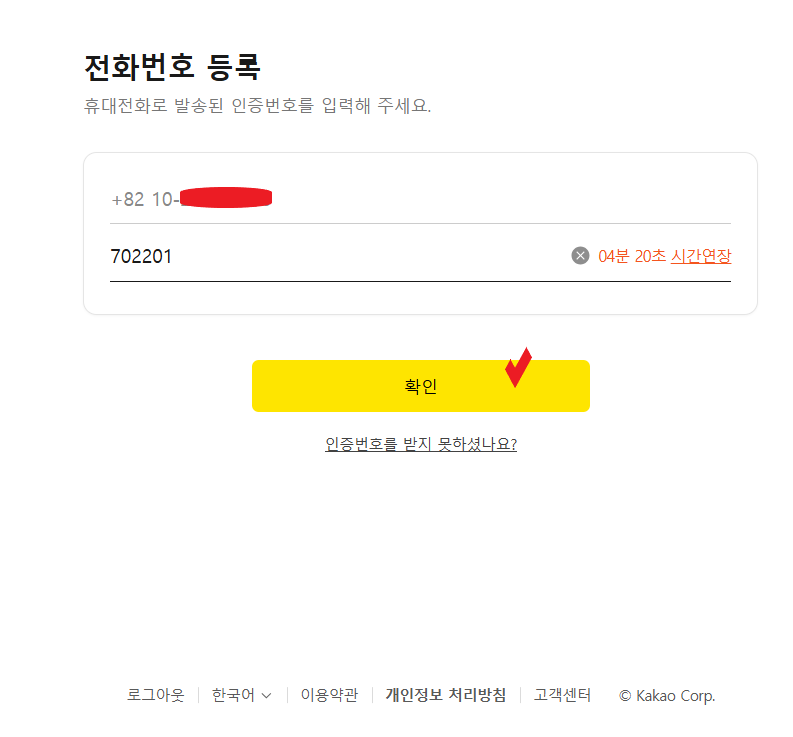 인증번호 입력하시고 확인 클릭!